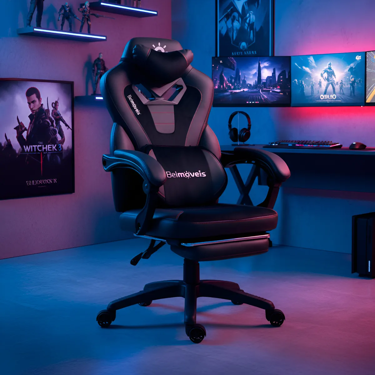 BLACK FRIDAY 22% OFF Adquira a Cadeira Gamer Couro PU Black Função Massagem Bmg2 da Belmóveis com acabamento em couro sintético premium. Aproveite o desconto de 22%, de R$ 1.866,53