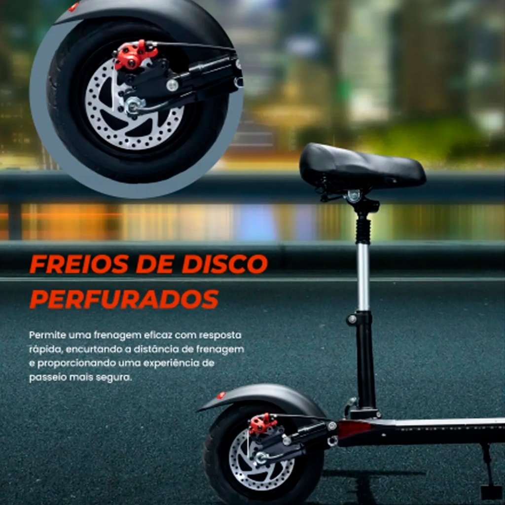 Assento ergonômico para passeios longos, design profissional e uma estrutura robusta. Vamos falar de conforto? Este patinete tem tudo para ser sua escolha número um!