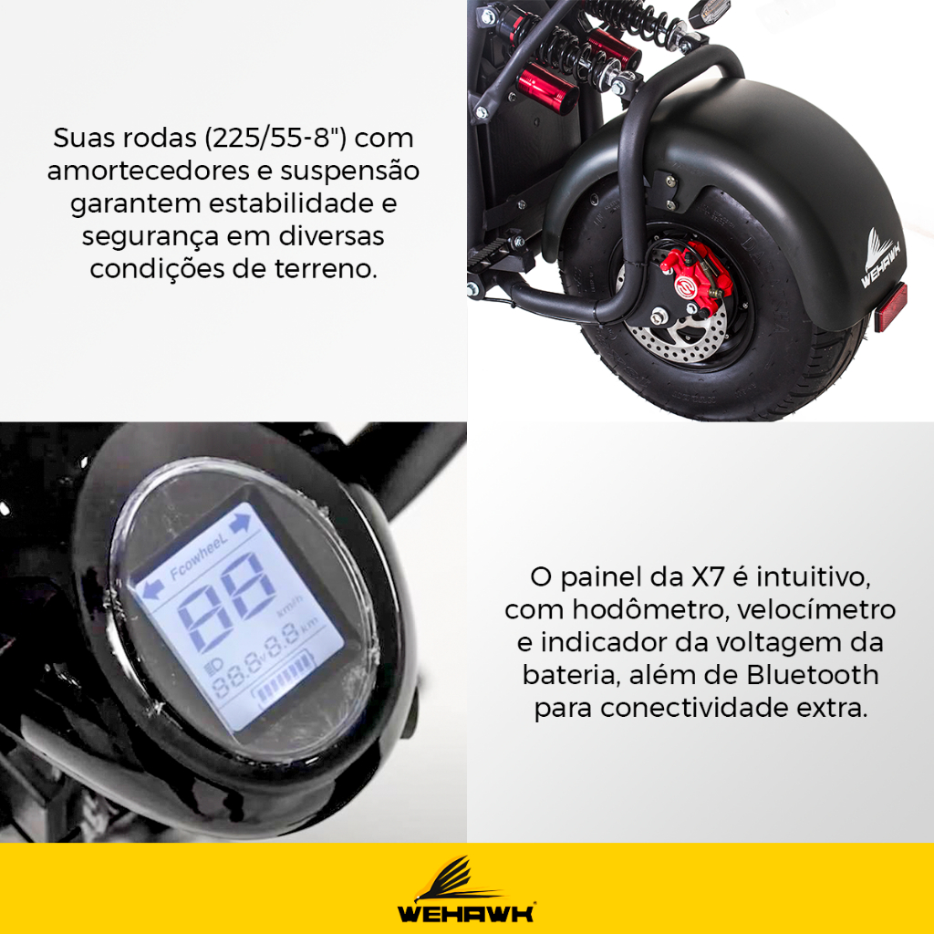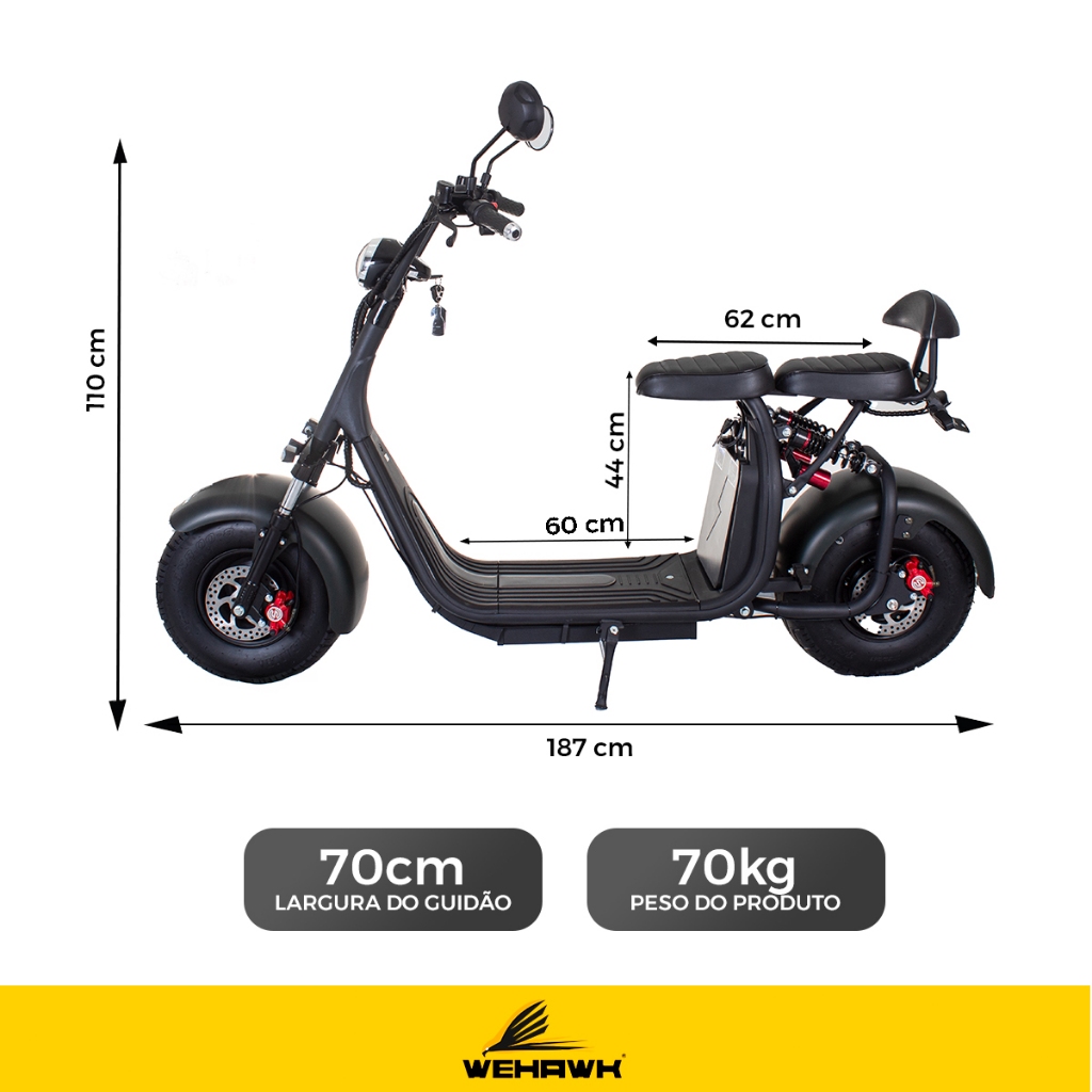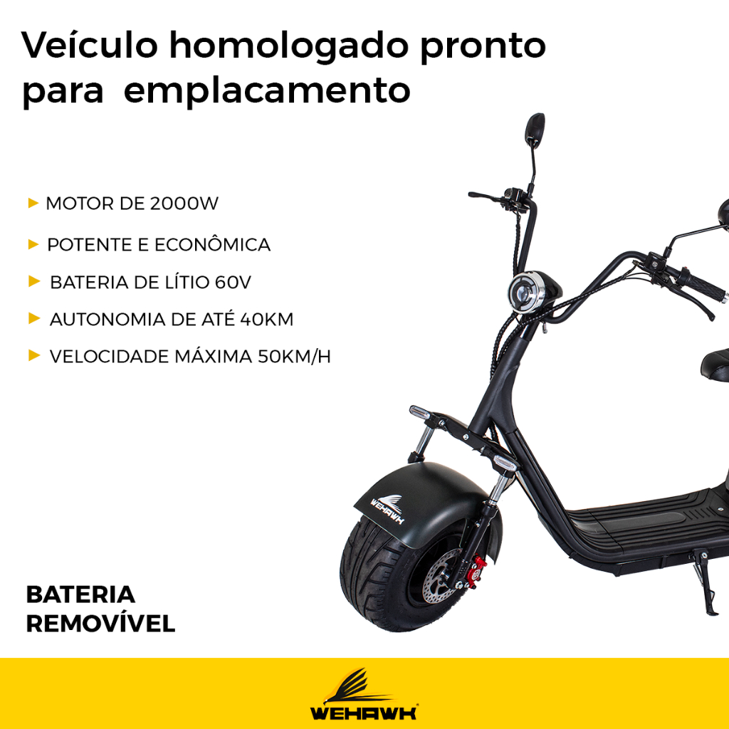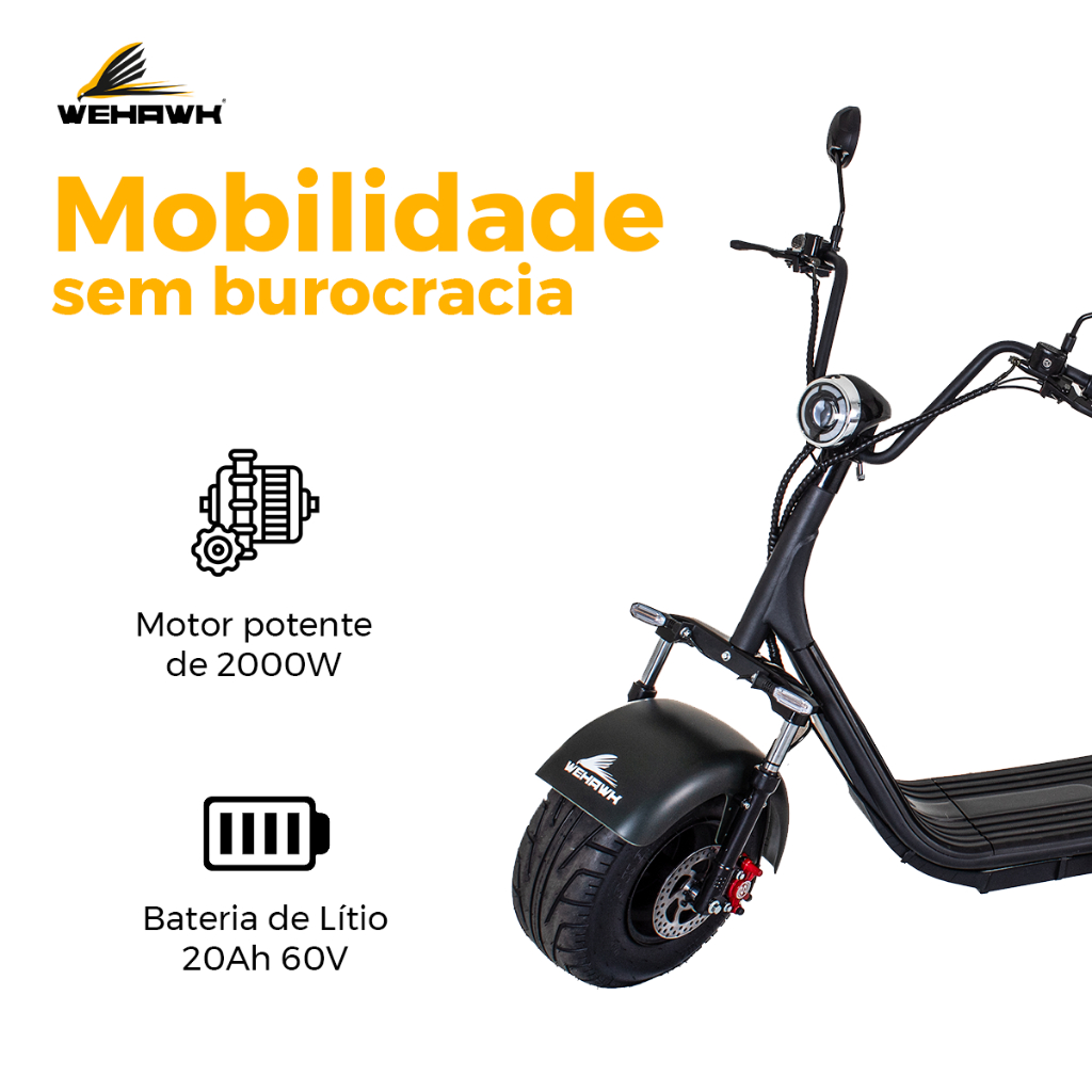 A Scooter Moto Elétrica WeHawk WX-07 entrega 2000W de potência para que você sinta a adrenalina no asfalto com desempenho incomparável.